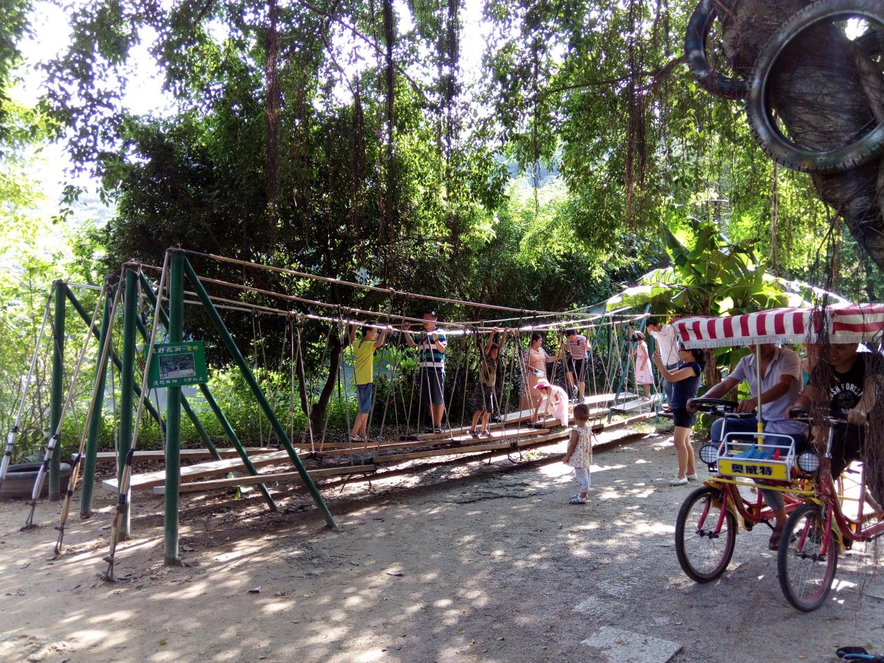 天然氧吧:乐园拥有雄伟壮观的山体瀑布、世界最大的载入吉尼斯纪录的17米凤凰雕塑、自然资源丰富多彩,山林湿地与湖水飞鸟和谐相融,园内鸟类超过60种,是岭南著名的野生鹭鸟栖息地,岭南水乡风情遍布全园,生态优越。同时拥有充满乐趣、动感的休闲项目:真人CS、复古电动画舫游船、脚踏车、竹排、单车、越野长廊、富有挑战性的轮胎秋千、轮胎跳网、轮胎穿越、轮胎桥、八卦池、轮胎墙、侠客桥、隧道桥、铁索横江、梅花桩、少儿攀岩等,让您尽情享受回归大自然的乐趣。另外更有园区新增的萌宠园、采摘园与桃花酒坊预计在今年6月底完工。