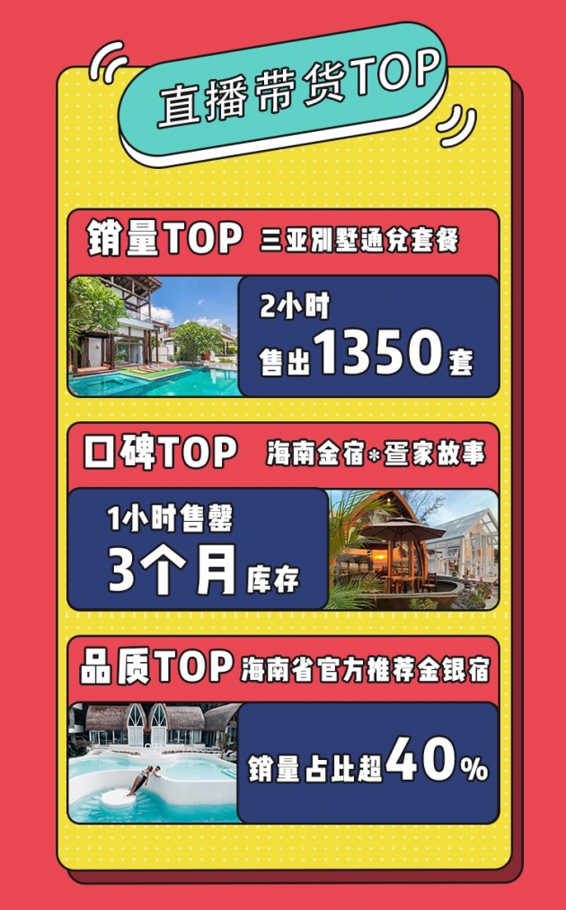 根据飞猪数据显示,直播2小时,交易量突破200万,直播累计观看人数超过50万,互动量超180万。其中三亚别墅民宿通兑套餐两小时内即售出1350套,海南省金宿单位疍家故事,直播1小时即售空三个月库存。而此次海南省官方推荐金银宿单位整体销量占比超40%,无论是南洋风情十足的骑楼民宿、与海滩咫尺之遥的特色船屋、网红打卡的爆红泳池民宿,这些颇具海南风土人情的金银宿,也受到了观众们的热捧。