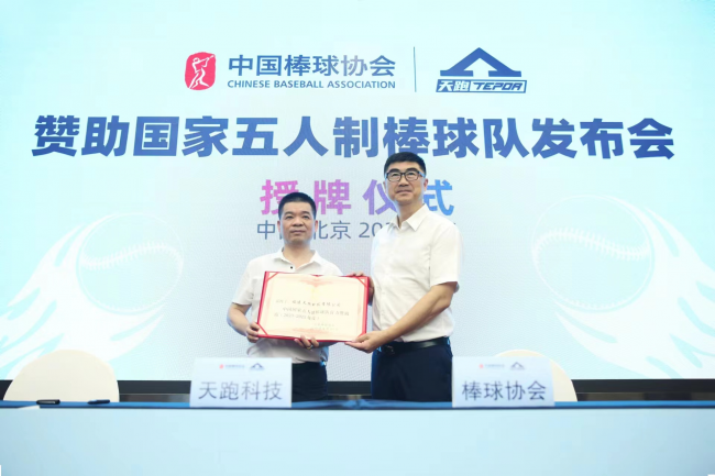 2023年8月17日,中国国家五人制棒球队赞助签约发布会在北京京燕饭店正式举行。会上,中国棒球协会向国潮新锐运动品牌——TEPOR天跑正式授牌,指定TEPOR天跑作为国家五人制棒球队唯一指定运动服装类(包含鞋、箱包及配件配饰)赞助商。