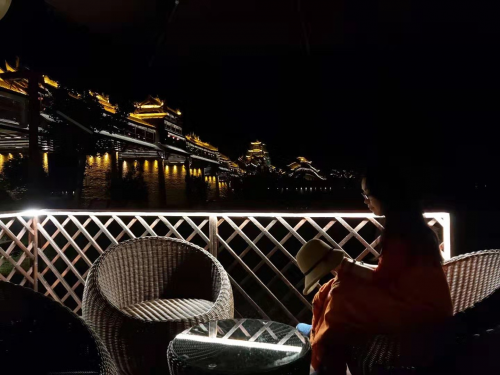 夜晚,坐在阿蓬江边,观赏风雨廊桥夜景、水运码头,嬉戏玩耍。