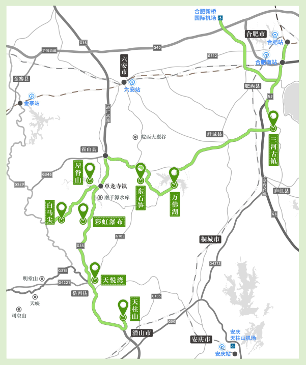 合肥新桥国际机场、合肥站、合肥南站、安庆站、安庆天柱山机场
