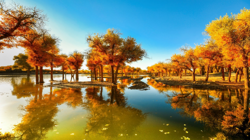 除去八道桥风景,弱水·金沙湾胡杨林风景区、大漠胡杨林景区、沃布格德音淖尔(老人湖)景区也是欣赏胡杨林的最佳去处。“胡杨百媚生,陷于弱水情”,弱水之畔,日出日落之时,漫天红霞,橘红圆日,碧波荡漾的湖面倒映着金色的胡杨,极美剪影令人惊艳。大漠胡杨林景区,集沙漠、弱水、红柳、怪树、胡杨林于一体,给你一个崭新的视角,让你全方位体验胡杨美景。沃布格德音淖尔(老人湖)景区,林中胡杨参天、红柳交错,或似苍龙腾跃、或似怒蛟狂舞、或似凤飞妩媚、或似老虬沧桑...在这里,每株胡杨也似乎有着讲不完的故事等待着述说。