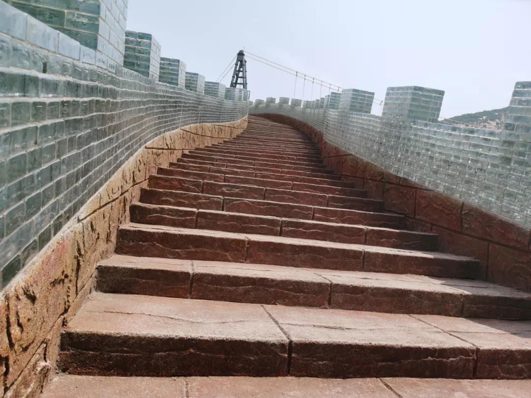 毗邻玻璃栈道,是全国唯一的水晶长城,一座300多米长的水晶长龙,蜿蜒盘旋、气势磅礴;水晶烽火台,一个连着一个,阳光照耀下,晶莹剔透,熠熠生辉。
