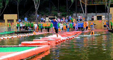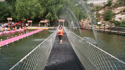 在景区入口处即可俯瞰清凉谷水上娱乐“快乐向前冲”,项目包含:水上软桥、击鼓喷泉、跨跃水上浮萍、水上翻翻乐、水上钢丝、水滑梯、凌波微步七大板块。