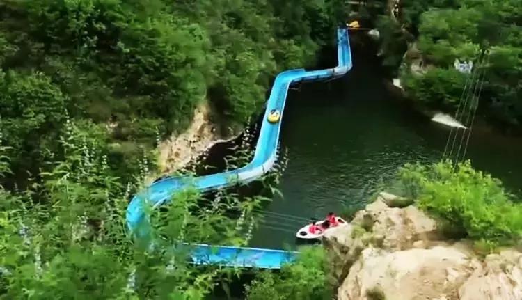 绕过清凉湖,来到“高山漂流”始发站。清凉谷高山漂流项目全长超过3000米,落差高达200米,碟水造浪300多处,途经4个戏水湖泊,是国内唯一一条穿越峡谷隧洞、山涧丛林的专业级高山滑水漂流赛道。
