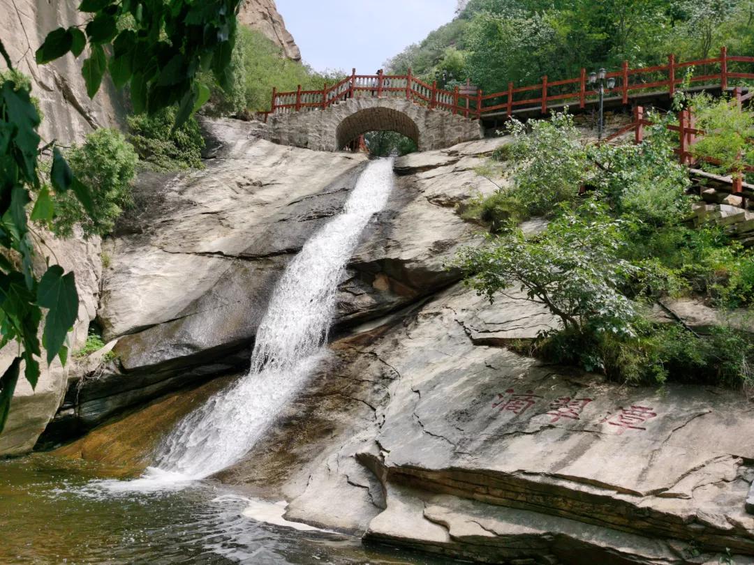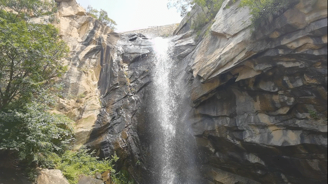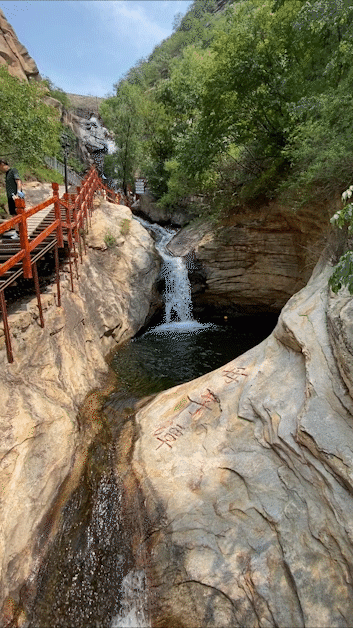 这是“迎仙瀑”的声音,仿佛在欢迎我们的到来。瀑布落下几十米,与石壁相击,在山脚激起千波万浪,水雾蒙蒙,给山涧林木披上了一层薄薄的轻纱。