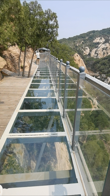 清凉谷5D玻璃天桥与水晶长城遥遥相对,行走在这条玻璃桥之上,悬空万丈,宛如仙境,望脚下谷幽水秀、石奇林茂,这时天桥上的某一块玻璃踩下去会突然“爆裂”,真是惊险刺激!