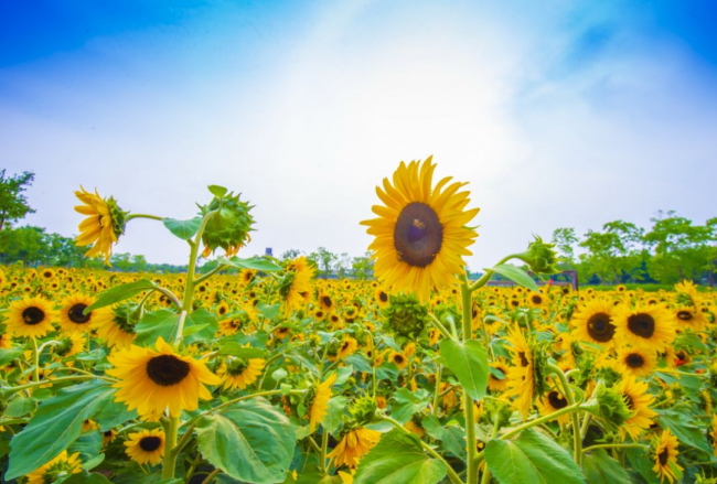 漫步在三台山的花海之中,遇见柳叶马鞭草、美女樱、天蓝鼠尾草等组成的紫色花海,宛如精灵的住所一般梦幻;走进向阳而生的向日葵花海,眼前一片片金灿灿的葵花仿若油画般灵动夺目。