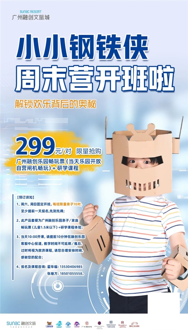 “小小钢铁侠周末营”为广州融创乐园亲子/家庭畅玩票+研学课程体验套餐,每班限量亲子10对或家庭7组,逢周六、日固定开班,299元限量抢购。在课程中,参与家庭/亲子将获得了解科技人文知识的机会,在导师的指导下探索融创乐园背后的奥秘;课程结束后,导师总结、验收学习成果并颁发研学证书。自由活动时间可随意畅玩融创乐园,涵盖千年商都、海上丝路、岭南印象、南越古国、五羊传说、梦幻花园、泡泡泉小镇7大主题区域,双龙飞舞、飞越广东、云霄塔、五羊飞天等明星项目放肆玩!